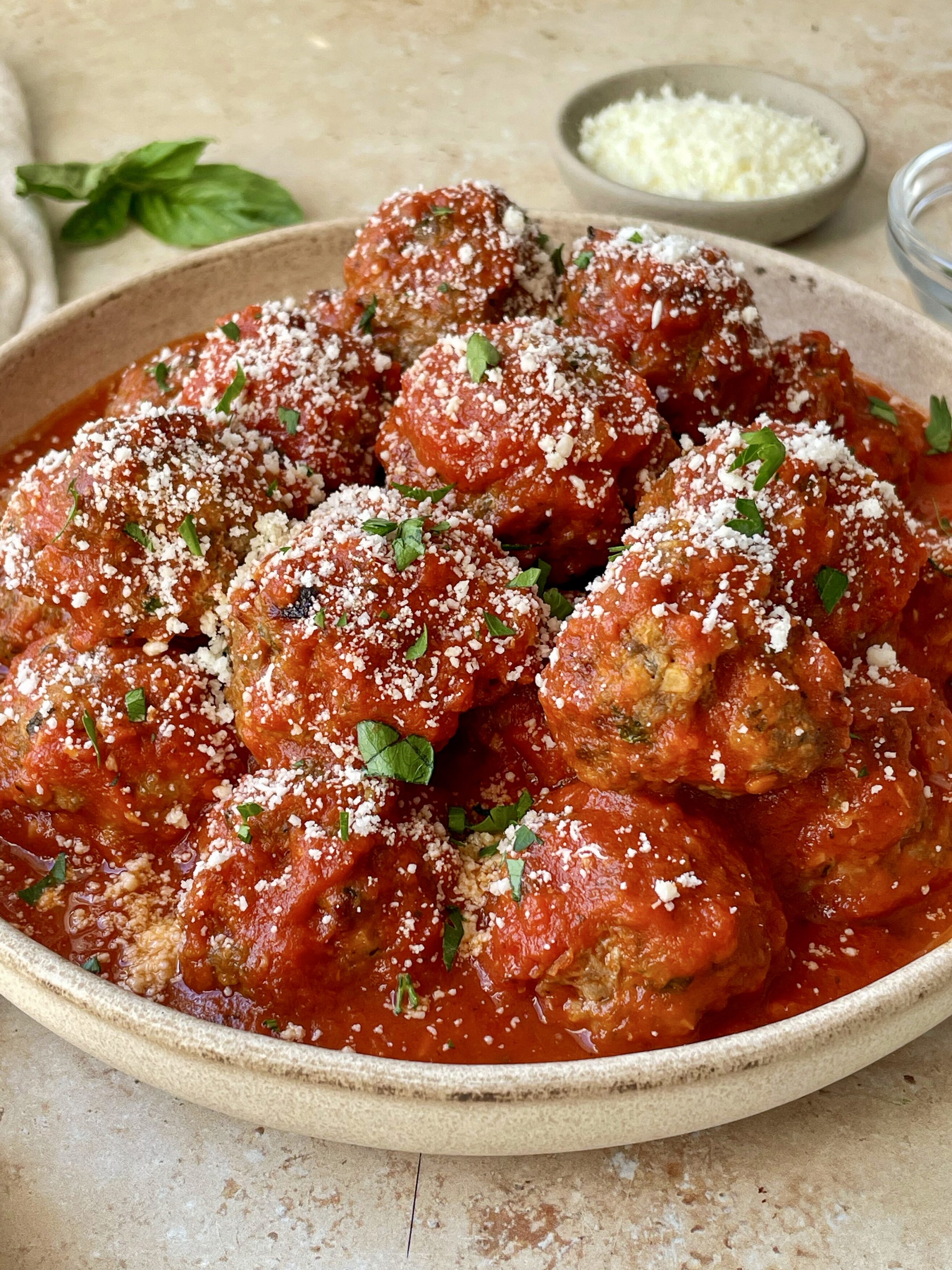 These tender baked Italian meatballs are made with beef, pork, and veal, herbs, cheese, and soaked bread. They’re juicy, flavorful, and easy to make for dinner or meal prep!